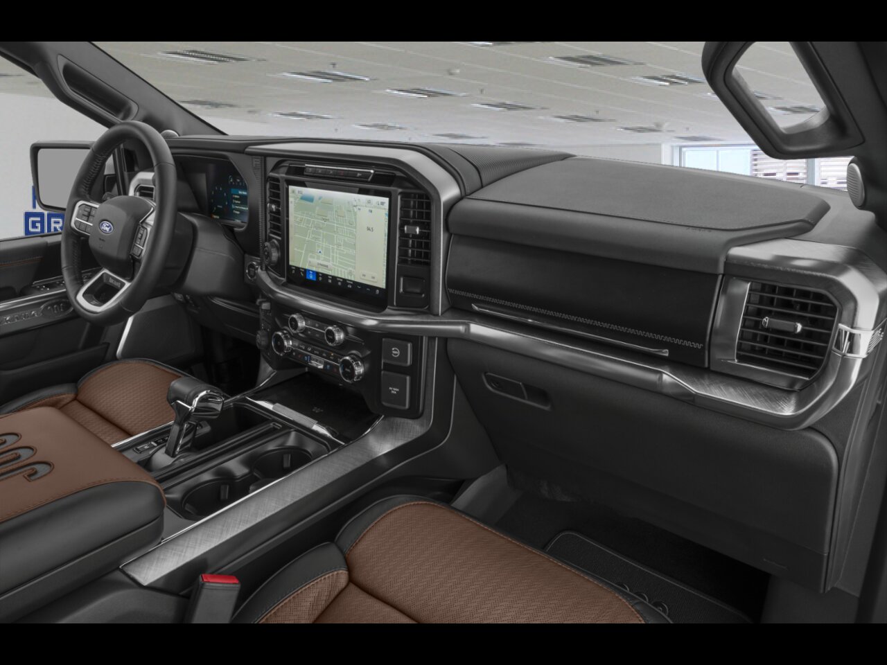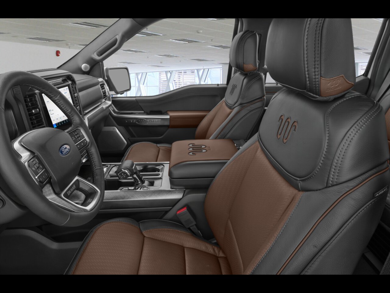 • Sièges baquets multicontours en cuir King Ranch -comprend : sièges chauffants et ventilés avec fonction de mouvement actif, siège conducteur à réglage électrique en 10 directions, siège passager à réglage électrique en 8 directions, soutien lombaire à réglage électrique côtés conducteur/passager, fonction de mémorisation pour le siège conducteur, appuie-tête réglables en 4 directions côtés conducteur/passager et console continue avec levier sélecteur au plancher